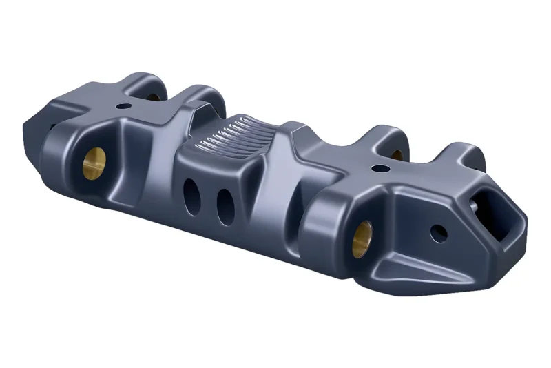 Cast manganese steel crawler shoes are work-hardened to 500 BHN, providing exceptional wear resistance while maintaining excellent toughness.